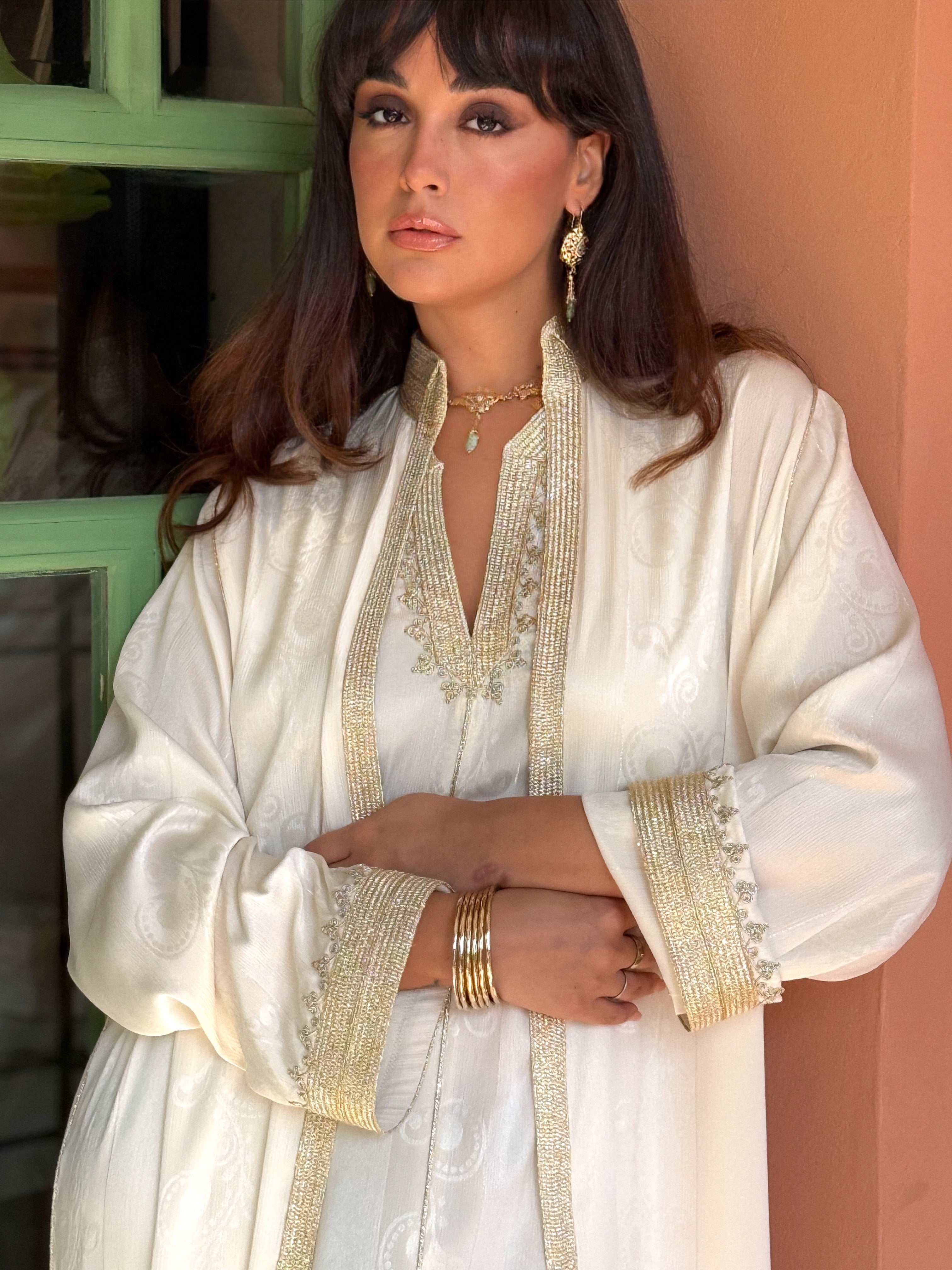 Discover our curated collection of kaftans — crafted from luxurious silks, shimmering brocades, and other precious fabrics. Each piece is hand-embroidered and finished with delicate artisanal details, celebrating the savoir-faire of Moroccan couture.